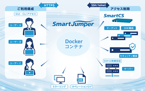 「SmartJumper」は、サーバーやネットワーク機器に対してシンプルで直感的な操作を行えるセキュアなアクセス管理ツールです。コンテナ上で動作し、運用者と管理対象機器の間に配置することでIT機器へのアクセスを一元的に管理できるようになります。